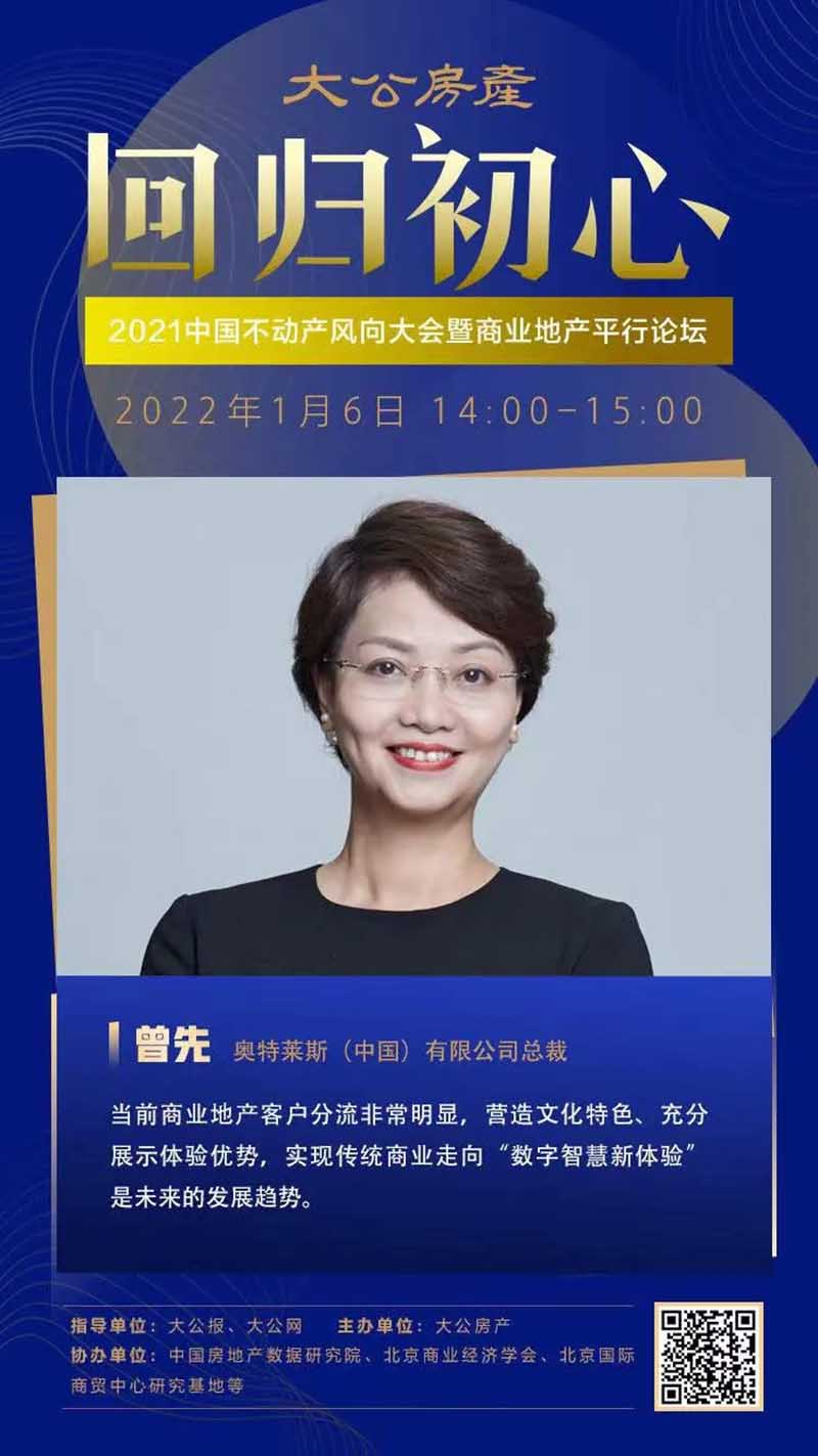 2022年1月6日,由大公網(wǎng)房產(chǎn)頻道聯(lián)合多方機(jī)構(gòu)舉辦的“【回歸初心】——2021中國(guó)不動(dòng)產(chǎn)風(fēng)向大會(huì)暨商業(yè)地產(chǎn)平行論壇”線上直播活動(dòng)正式開始。本期論壇以“回歸初心”為主題,邀請(qǐng)了行業(yè)內(nèi)知名專家、商業(yè)地產(chǎn)企業(yè)領(lǐng)袖等,圍繞行業(yè)周期下的危與機(jī)、新時(shí)代下商業(yè)地產(chǎn)的運(yùn)營(yíng)管理手段、新周期下如何堅(jiān)守商業(yè)初心等話題展開討論,解析行業(yè)機(jī)遇挑戰(zhàn)及復(fù)蘇破局之道。奧特萊斯(中國(guó))有限公司總裁受邀參加本次活動(dòng),并進(jìn)行了精彩的線上直播發(fā)言。