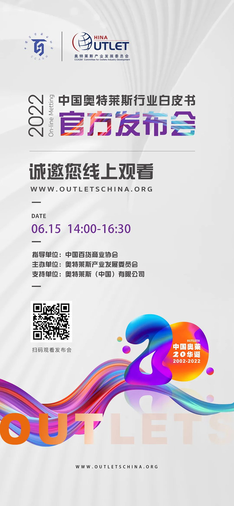 6月15日14:00,點(diǎn)擊奧特萊斯產(chǎn)業(yè)發(fā)展委員會(huì)官方網(wǎng)站(http://www.outletschina.org),《2022年中國(guó)奧特萊斯行業(yè)白皮書》線上發(fā)布會(huì)直播間誠(chéng)邀您的觀看。