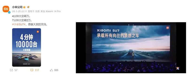 更令人矚目的是,新車在發(fā)布后僅4分鐘內(nèi)便突破萬(wàn)輛大定,7分鐘內(nèi)更是飆升至2萬(wàn),上市短短27分鐘便鎖定了5萬(wàn)臺(tái)訂單,完美詮釋了“上市即熱銷”的盛況,小米汽車也因此被賦予了繼特斯拉之后“新鲇魚”的稱號(hào),SU7更是成為了2024年汽車界萬(wàn)眾矚目的焦點(diǎn)。