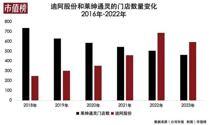 迪阿股份(股票代碼:301177),作為首飾市場(chǎng)中的一員,在“黃金熱潮”的沖擊下,已連續(xù)六個(gè)季度面臨營(yíng)業(yè)收入與凈利潤(rùn)的“雙重下滑”。2023年,其門店數(shù)量更是縮減了94家,降至594家,而萊紳通靈亦不例外,門店數(shù)量減少了44家,目前總數(shù)為463家。