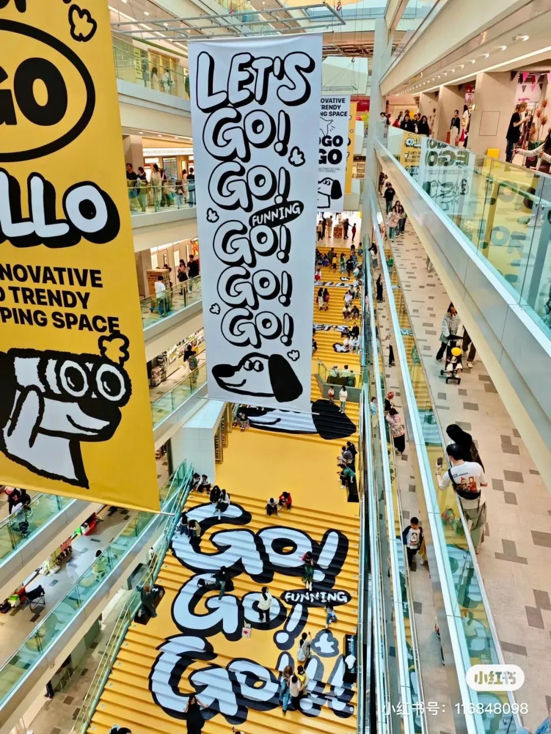 抵達商場入口,一抹鮮亮黃彩瞬間吸引目光;步入大堂,簡潔廣告語映入眼簾,色調(diào)與設計渾然統(tǒng)一,主通道沐浴在明媚黃光中,配以吉祥物GoGo萌態(tài)畫像,攝影佳作信手拈來,隨手一拍皆是風景畫。