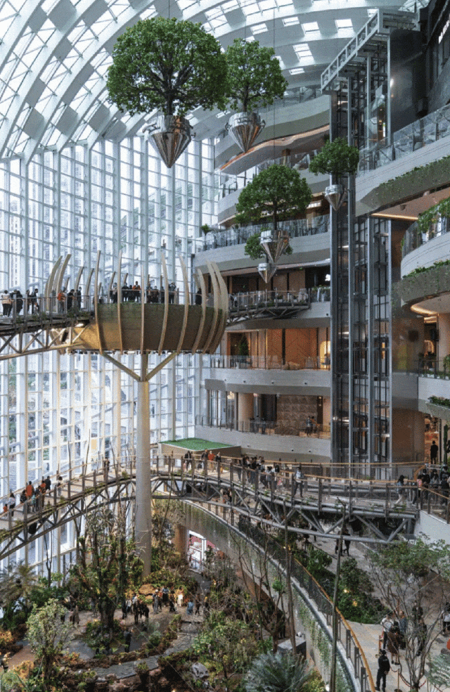 其中,「沐光森林」作為光環(huán)的標(biāo)志性景觀,以其縱跨6層、高達(dá)42米的室內(nèi)立體垂直植物園之姿,成為了眾人矚目的焦點(diǎn)。懸空其間的步行棧道,如同穿梭于綠色世界的秘徑,讓顧客在享受購物樂趣的同時(shí),也能感受到大自然的呼吸。這條懸空跨層步道,不僅巧妙地連接了商業(yè)區(qū)域與森林景觀,更讓每一次購物之旅都充滿了探索自然與發(fā)現(xiàn)驚喜的奇妙體驗(yàn)。