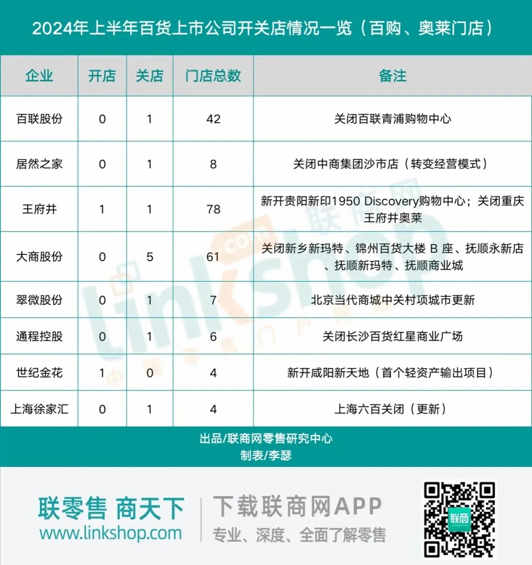 在門店的開設(shè)與關(guān)閉動態(tài)上,2024年上半年呈現(xiàn)出一個顯著的趨勢:關(guān)店數(shù)量遠(yuǎn)超開店數(shù)量。具體而言,44家百貨上市公司在此期間僅新增了2家門店(此數(shù)據(jù)僅限于百貨商店、購物中心及奧特萊斯門店),而關(guān)閉的門店數(shù)量則達(dá)到了11家。與之形成對比的是,去年同期這些公司開關(guān)店的數(shù)量均為5家。這一變化表明,與去年相比,百貨上市公司在開設(shè)新店方面變得更加謹(jǐn)慎,而關(guān)閉門店的速度卻在加快。