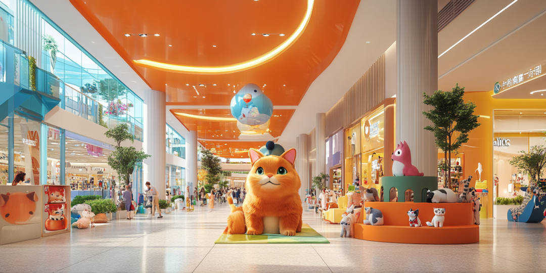 A場景:位于寵物友好購物中心一層,連接室內(nèi)外區(qū)域有家寵物零售店,店門口提供寵物推車,貨品陳列展臺尤其是寵物玩具類展臺略高于寵物推車,與寵物視線基本持平。店鋪店員自帶友好氣質(zhì),對來訪寵物的主動親親貼貼毫無抵抗力。店內(nèi)到處可見主人們各自推著小車帶著貓貓狗狗,三三兩兩聚在一起聊著自家寶貝的名字、習(xí)慣與性格。直接進入商場或從店鋪進入商場都無需回避安保人員的“眼神拷問”,符合城市飼養(yǎng)規(guī)范的寵物均可自由進場。