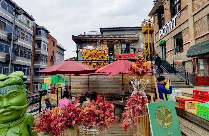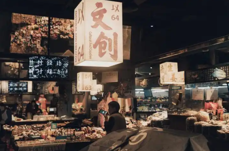 其中,信義巷子主要匯集特色小鋪,一樓布滿如陜西特產、小磨香油、新鮮肉鋪等門面,二樓則由咖啡館、美甲店等小店組成。每家店鋪頂部都有懸掛老菜場統(tǒng)一設計的小旗幟,既和諧統(tǒng)一又各含特色;有戲主題板塊主要以脫口秀,劇本殺,婚禮,攝影及文創(chuàng)手工等工作室等業(yè)態(tài)為主,以“有戲”為名也代表著希望,象征著新銳市井文化的希望;悅夜板塊,主要匯集酒吧、民宿等多種休閑元素。尋味板塊,則提供少燒烤、韓料、特色小吃等餐飲。
