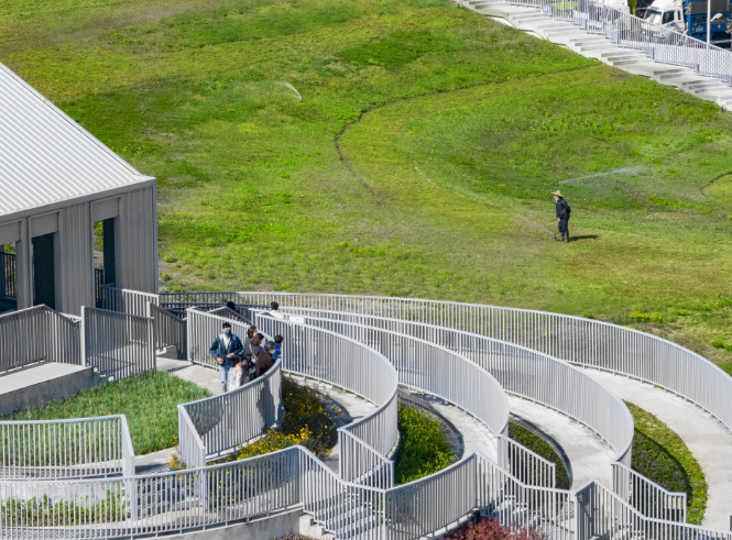 在建設空間設計上,項目將市場與公共綠地完美融合,摒棄了傳統(tǒng)菜市場簡單金屬棚的形式,屋頂打造為被草地和花田覆蓋的公園。建筑呈現(xiàn)為一個簡單的開放式結構,起伏的綠色屋頂猶如延綿的山丘,屋頂?shù)臇|側角落是一塊種植著繽紛植物和花卉的階梯狀區(qū)域,屋頂從該側向下延伸至地面,使游客可以輕松到達建筑頂端。在建筑的側面,一個簡單的四層結構容納了市場的行政辦公室和展覽中心,后者可用于展示當?shù)氐霓r業(yè)產品。